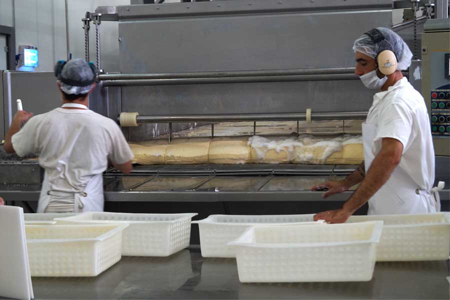 Las partículas de cuajada y el suero se llenan desde un depósito de almacenamiento. Allí, las partículas de cuajada se mezclan entre sí de forma gradual y se escurre el suero. Luego, las piezas se cortan , se llevan a un molde y finalmente a un sistema de prensado. Mientras tanto, el suero se recolecta y se descarga para que siga recibiendo más procesado.